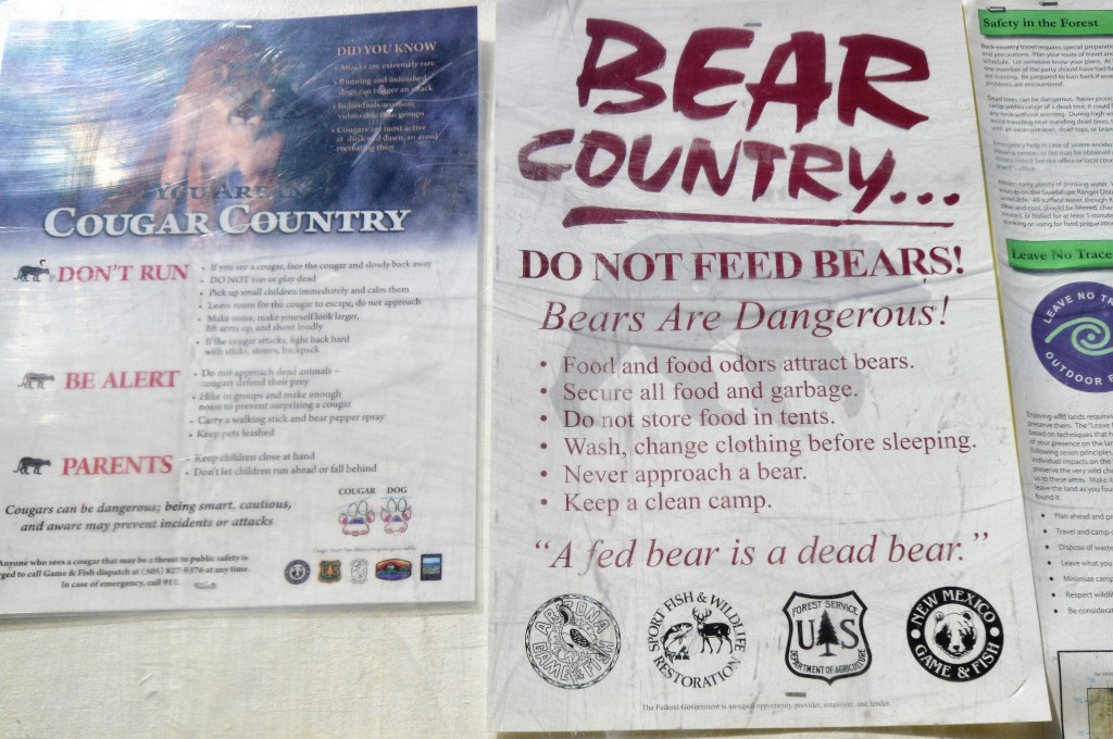 I recalled my early morning dreams of living wild and free among the graceful and gentle animals of the desert with a new level of caution and fear. The desert can be a dangerous place for those who don’t know how to read or recognize the natural signs that there is potential danger lurking behind that bolder or just over the ridge. Thanks to the U.S. Forest Service us city-folk types have these manmade signs to keep us safe!