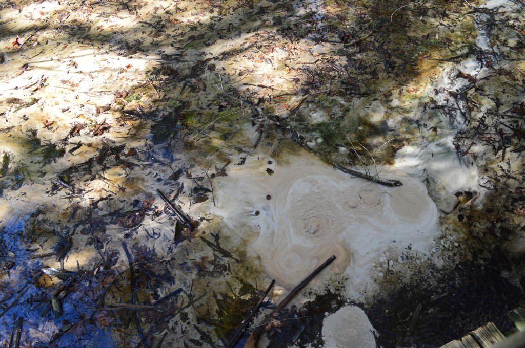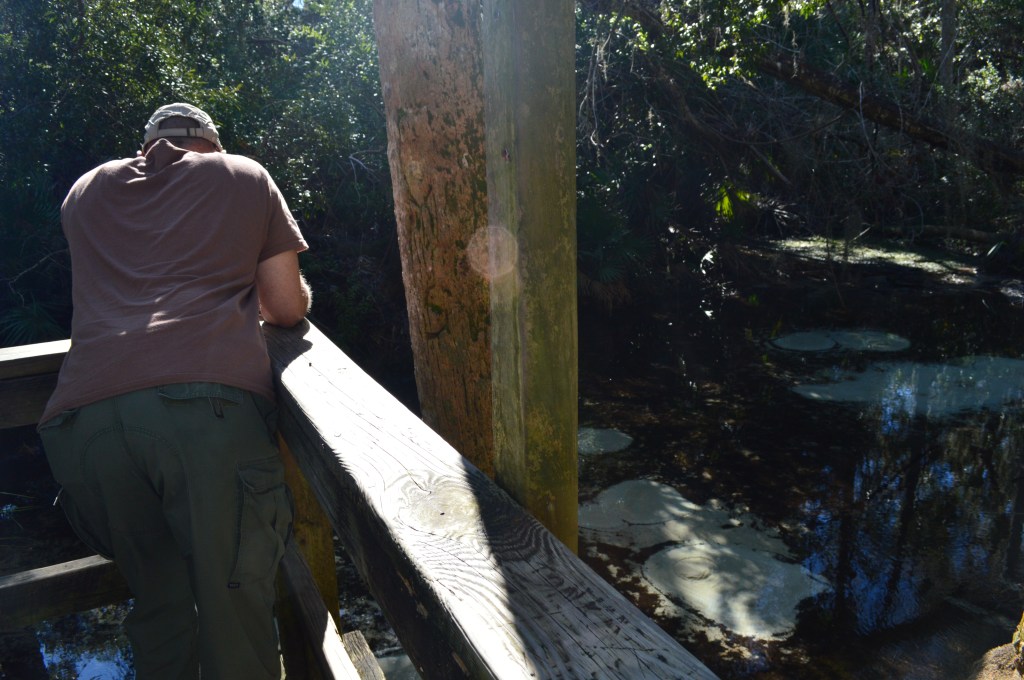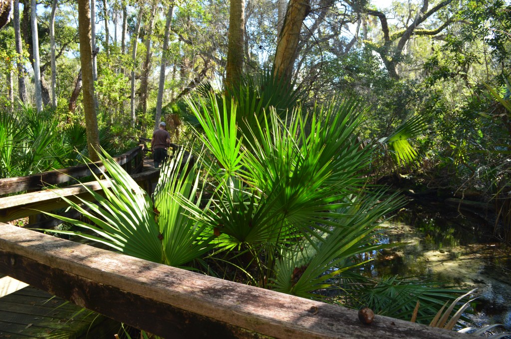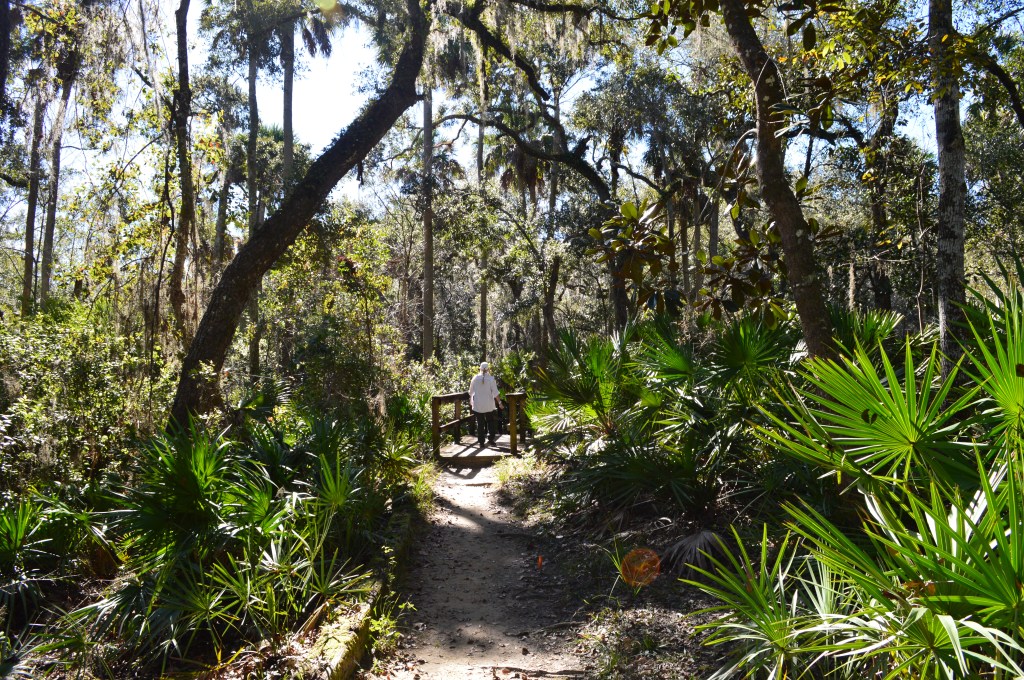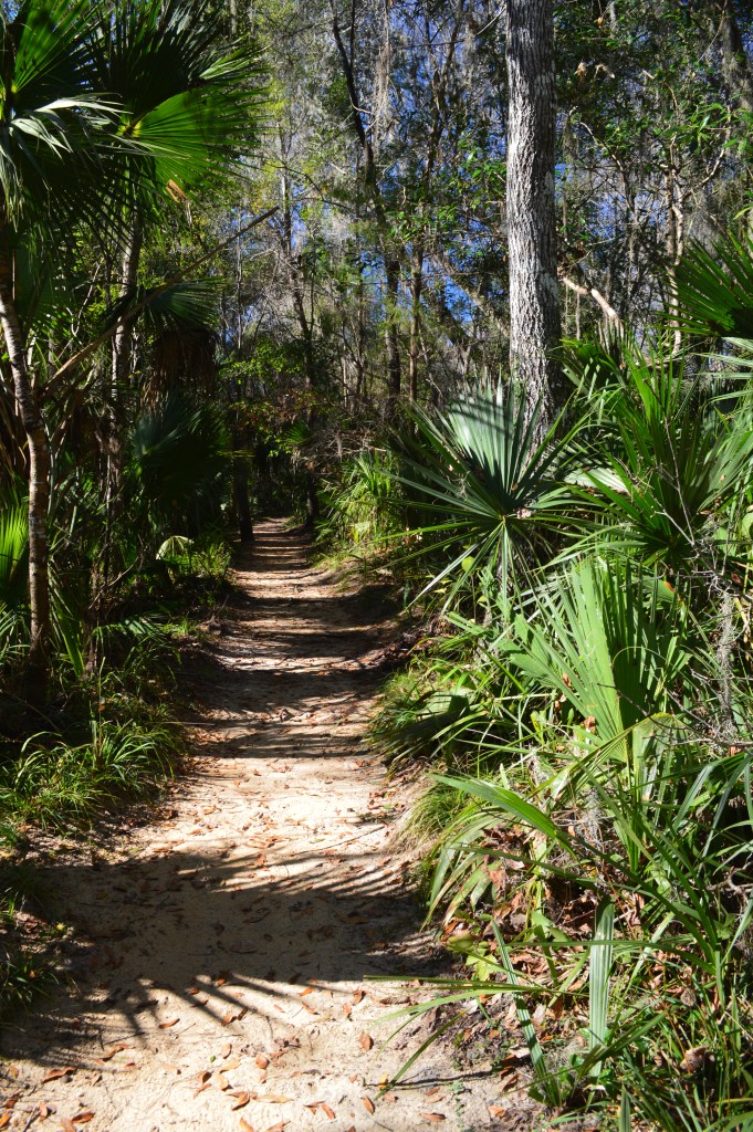 The first of the two trails we struck out on was the shorter Spring Boils Trail. We strolled beneath oaks and palms along a gently sloping sandy trail before reaching the boardwalk. At the end of the boardwalk is an overlook where we viewed several small springs bubbling up through the sand. If you’ve read The Yearling by Marjorie Kinnan Rawlings you are familiar with Jody’s Spring.