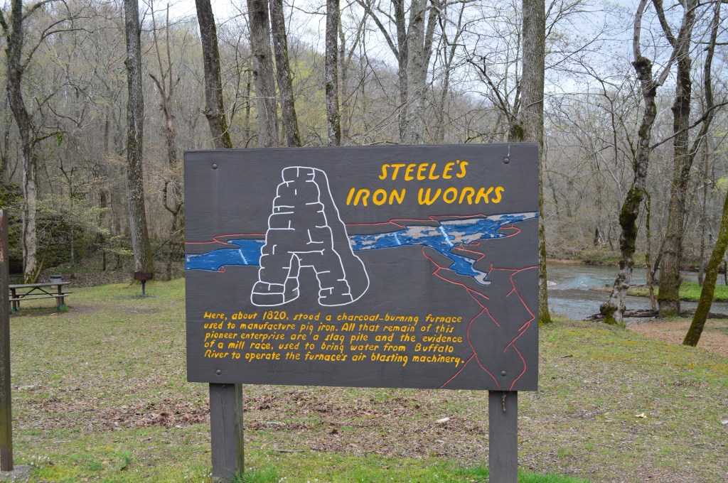 The second point of interest is that it’s also the spot of Steele’s Iron Works. The charcoal burning furnace once located here was part of the operations that produced pig iron (a crude iron) from the ore provided by Napier Mine.