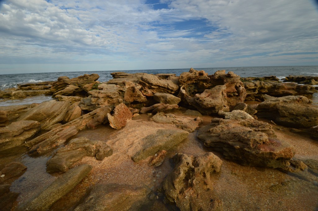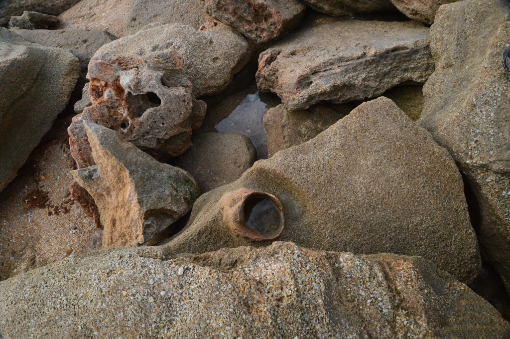 Interestingly the same acidic rain that creates the Coquina is also responsible for it’s destruction. The hole you see in the picture above is thought to be caused by the accumulation of rain in small depressions in the rock. The erosion process happens over time as each new rain deposits more acid which then eats away at the rocks making the hole bigger. Eventually the light acid can eat its way through the rock leaving a almost perfect hole as if someone had stamped it out on purpose with a tool.