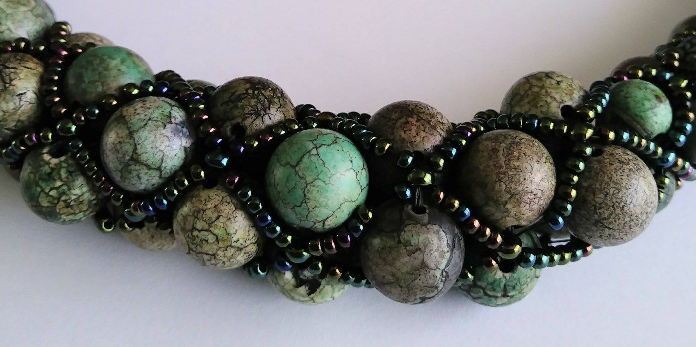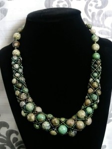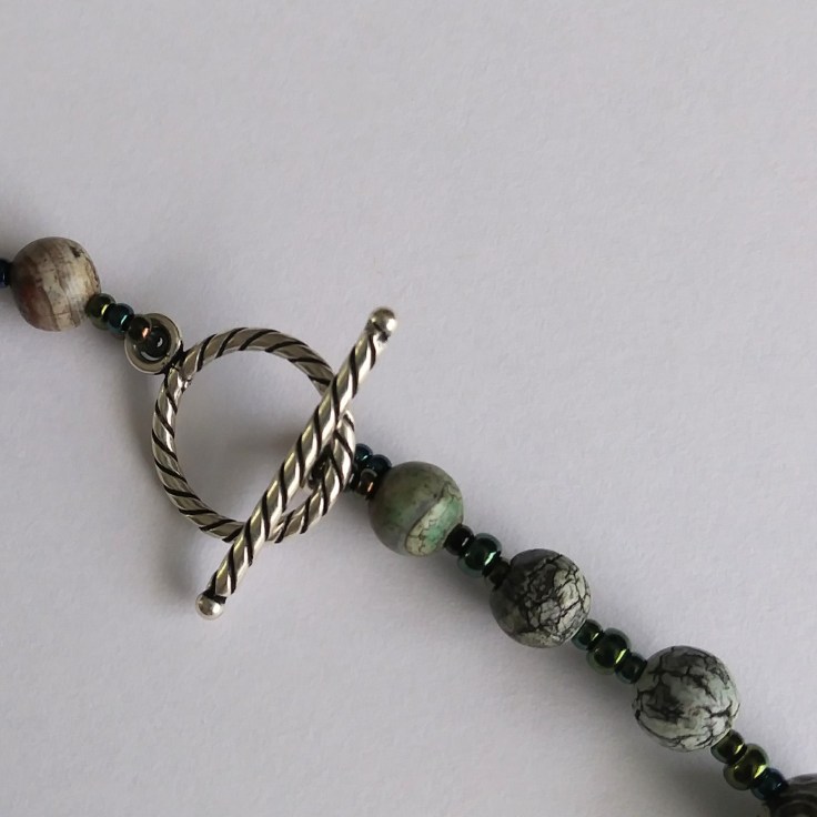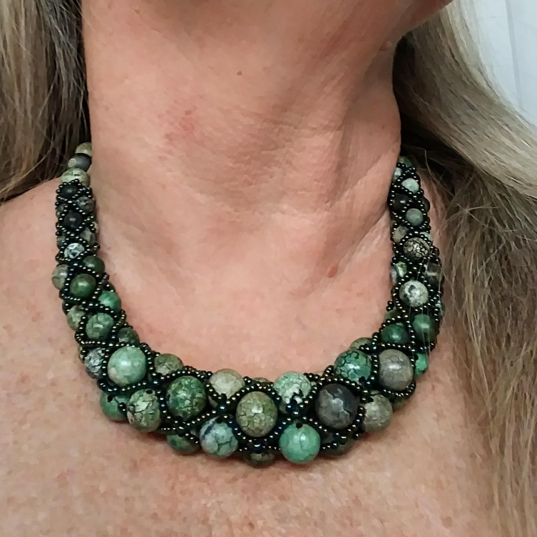 The crackled effect on the green agate stones evoked in me memories of gator eyes and cypress trees. The shiny green iris glass beads imitate a mosaic of scattered light as it struggles to filter through a canopy of lush leaves and wild orchids.
